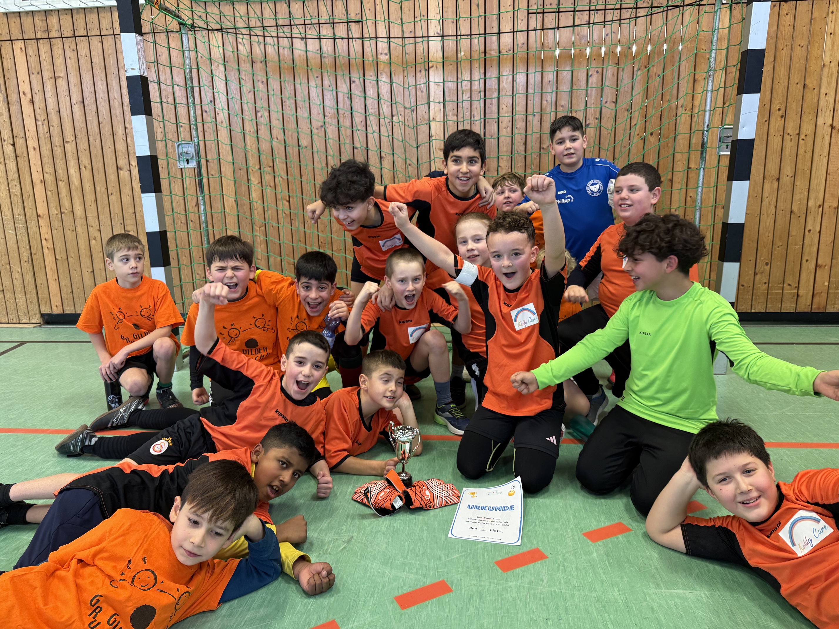 Neunzehn Fußballer der Gilden-Europa-Grundschule nahmen sehr erfolgreich mit zwei Teams am Turnier für Viert- und Fünftklässler an der benachbarten Gustav-Heinemann-Gesamtschule teil. In teils sehr deutlich siegreichen, teils auch sehr spannenden Spielen stürmte Team 1 bis ins Finale und musste sich erst dort den spielerisch und körperlich überlegenen Fünftklässlern des Gastgebers geschlagen geben. Alle Kinder, die zum Einsatz kamen, zeigten, was sie – teils neben der Spielaktivität im Fußballverein – auch wöchentlich in der OGS-AG von Anil Göcmen und in den Projektstunden von „BVB bewegt“ mit BVB-Spielerin Hannah Geldschläger gelernt haben. Vom Veranstalter wurde aber nicht nur das fußballerische Können, sondern insbesondere auch das Fair-Play-Verhalten aller Spieler gelobt. Die zahlreich erschienenen Fans und begeisterten Mitschüler auf der Tribüne feuerten beide Teams frenetisch an und waren auch nicht lange traurig über die Finalniederlage. Strahlend machte man sich gemeinsam mit Pokal und Urkunden im Gepäck nach der Veranstaltung wieder zu Fuß auf den kurzen Rückweg.